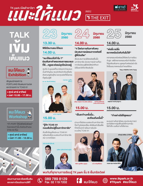 สำนักงานอุทยานการเรียนรู้ จัดกิจกรรม TK park เปิดตำราวิชา แนะให้แนว 23 – 25 มิถุนายน 2560 ณ อุทยานการเรียนรู้ ชั้น 8 ศูนย์การค้าเซ็นทรัลเวิลด์ เพื่อสร้างแรงบันดาลใจวิชาชีวิตให้กับนักเรียนระดับมัธยมศึกษาตอนปลายได้มองเห็นโอกาสและแนวทางของตัวเองก่อนที่จะก้าวเข้าสู่การศึกษาในระดับอุดมศึกษา ภายในงานมีการจัดเสวนาจากผู้ทรงคุณวุฒิหลากหลายสาขาอาชีพมาร่วมแบ่งปันความรู้ ถ่ายทอดประสบการณ์และแนวคิดในหัวข้อต่างๆ เพื่อให้สามารถนำไปใช้เป็นตัวเลือกในการต่อยอดพัฒนาพื้นฐานที่มี และเพื่อสร้างความแข็งแกร่งในการเผชิญหน้ากับเรื่องราวต่างๆ ในชีวิตจริงได้