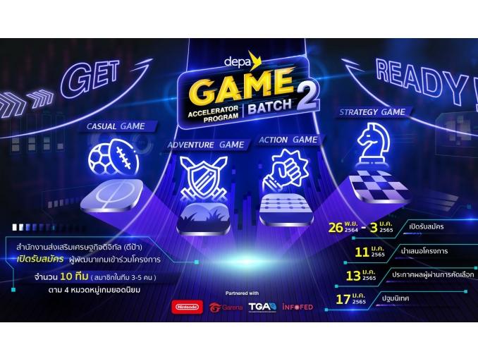 depa Game Accelerator Program มีวัตถุประสงค์ที่จะส่งเสริมและพัฒนาบุคลากรในอุตสาหกรรมเกมไทย โดยเฉพาะนักพัฒนาเกมให้มีศักยภาพและมาตรฐานเทียบเคียงกับผู้ประกอบการระดับโลก วางรากฐานความเป็นมืออาชีพให้กับนักศึกษาและผู้สนใจ ผ่านหลักสูตรฝึกอบรมใน 4 หมวดเกมยอดนิยม (Action, Adventure, Strategy และ Casual Game) รับสมัครผู้สนใจทีมละ 3 – 5 คนในแต่ละหมวดเกม ก่อนคัดเลือกเหลือ 10 ทีมที่จะได้เรียนรู้ เสริมสร้างองค์ความรู้ในการพัฒนาเกม พร้อมรับคำปรึกษาจากผู้เชี่ยวชาญในอุตสาหกรรม ภายในระยะเวลา 42 ชั่วโมง ซึ่ง 4 ทีมสุดท้ายที่ได้รับการคัดการเลือก (1 ทีมในแต่ละหมวดเกม) จะได้รับโอกาสทางธุรกิจ รวมถึงชุดพัฒนาเกม (Nintendo Development Kit) เพื่อนำไปต่อยอดผลงานต่อไป