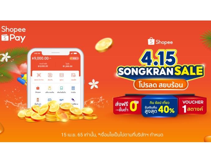‘ShopeePay’ (ช้อปปี้เพย์) ผู้ให้บริการด้านการชำระเงินผ่าน Mobile Wallet แบบครบวงจรบนช้อปปี้ เปิดเช็กลิสต์ตะลุยความสุขหรรษาฉลองวันหยุดยาวรับเทศกาลสงกรานต์กับแคมเปญ ‘Shopee 4.15 Songkran Sale’ โปรลด สยบร้อน กิน ช้อป เที่ยว กันให้หนำใจ พร้อมมอบของขวัญปีใหม่ไทยให้แก่ผู้ใช้งานด้วย Shopee Coins Cashback 40%[1] และส่วนลดสูงสุดถึง 400 บาท[2] เพียงใช้จ่ายผ่าน ShopeePay ที่ครอบคลุมทุกการใช้จ่ายตลอดช่วงเทศกาลสงกรานต์นี้