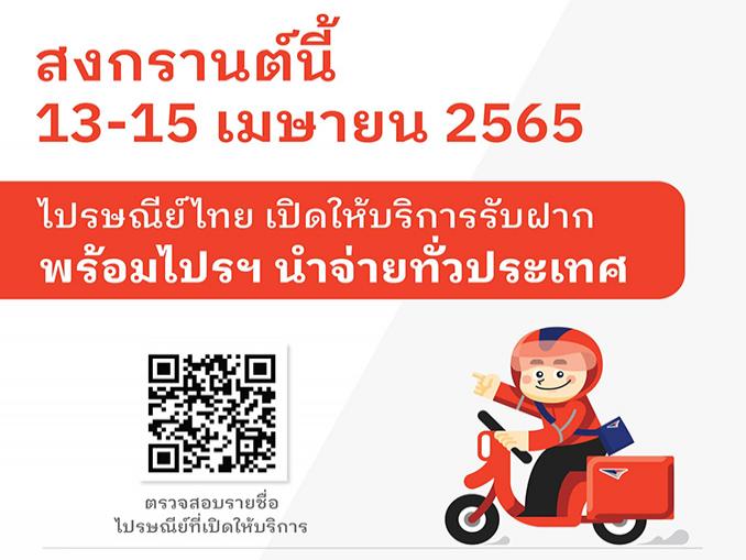 บริษัท ไปรษณีย์ไทย จำกัด (ปณท) เปิดให้บริการรับฝาก ในช่วงเทศกาลสงกรานต์ ในวันที่ 13-15 เมษายน 2565 เปิดให้บริการที่ไปรษณีย์จังหวัดทุกแห่ง ไปรษณีย์ขนาดใหญ่ในเขตกรุงเทพฯ ปริมณฑล และต่างจังหวัด ไปรษณีย์ในห้างสรรพสินค้า ไปรษณีย์ในศูนย์ไปรษณีย์ ไปรษณีย์ในท่าอากาศยาน และสถานีบริการน้ำมัน และพร้อมนำจ่ายทุกวัน ทุกแห่งทั่วประเทศ เพื่ออำนวยความสะดวกแก่ผู้ใช้บริการ
