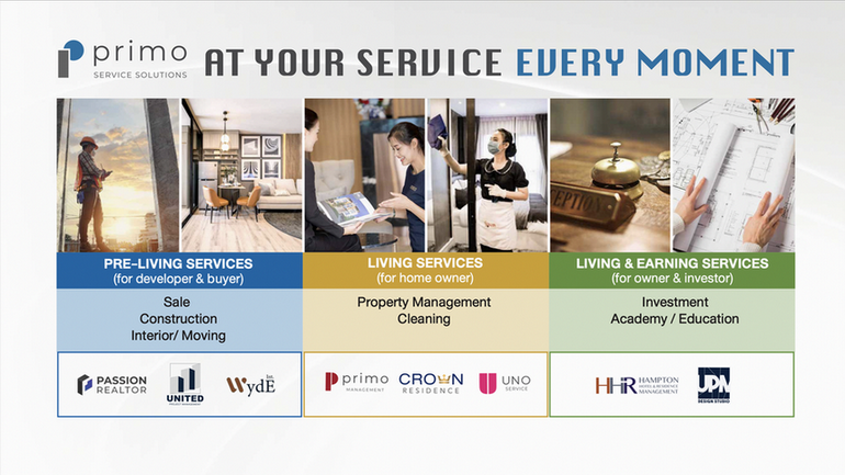 2. กลุ่ม Living Services ให้บริการเมื่อผู้บริโภคเข้าพักอาศัยแล้ว ประกอบด้วย ธุรกิจบริหารจัดการอาคาร ดำเนินการโดย บริษัท พรีโม แมเนจเม้นท์ จำกัด (Primo Management) และบริษัท คราวน์ เรสซิเดนซ์ จำกัด (Crown Residence) รับบริหารจัดการนิติบุคคลอาคารชุด บ้านจัดสรร อาคารสำนักงาน ศูนย์การค้า ดูแลคุณภาพชีวิตของลูกบ้านระหว่างการพักอาศัยทั้งในระดับโครงการทั่วไปจนถึงระดับลักชัวรี ธุรกิจบริการความสะอาดครบวงจร โดย บริษัท อูโน่ เซอร์วิส จำกัด บริการทำความสะอาดครบวงจร ให้บริการแก่ทั้งลูกค้าองค์กรและผู้บริโภคทั่วไป