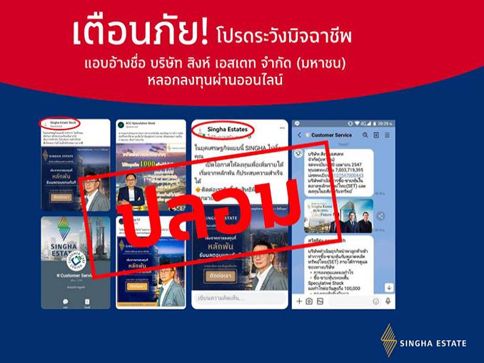 จากกรณีที่มีผู้ไม่หวังดี แอบอ้างชื่อ บริษัท สิงห์ เอสเตท จํากัด (มหาชน) ตราสัญลักษณ์ของบริษัทฯ รูปผู้บริหารของบริษัทฯ ตลอดจนข้อมูลหรือภาพต่างๆ ของบริษัทฯ ไปใช้บนช่องทางสื่อและเครือข่ายสังคมออนไลน์ (Social Media and Social Networking) เพื่อหลอกลวงและชักชวนให้ประชาชนหลงเชื่อเพื่อเข้าร่วมลงทุนซื้อ-ขายหลักทรัพย์ของบริษัทฯ ผ่านช่องทางดังกล่าว