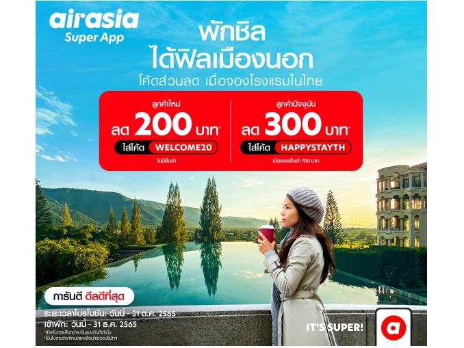 แจกโค้ดส่วนลดโรงแรม 300 บาท ทุกการจองโรงแรมในประเทศ ผ่าน airasia Super App เพียงจองขั้นต่ำ 700 บาทขึ้นไป ใช้ส่วนลดได้ 1 ครั้งต่อ 1 ผู้ใช้งานเท่านั้น สำหรับลูกค้าใหม่และลูกค้าเก่า จองตั้งแต่วันที่ 17 – 31 ตุลาคม 2565 นี้เท่านั้น เข้าพักได้ตั้งแต่วันที่ 17 ต.ค. 2565 - 31 ธ.ค. 2565