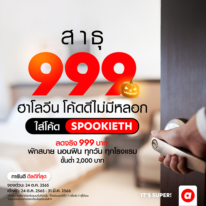 มอบส่วนลดส่งท้ายเดือนตุลาคมช่วงเทศกาลฮาโลวีน ด้วยโค้ดสุดพิเศษ เพียงใส่ "THB999" เมื่อจองโรงแรมในประเทศผ่าน airasia Super App ขั้นต่ำ 2,000 บาท รับไปเลยส่วนลดค่าโรงแรม 999 บาท สำหรับลูกค้าใหม่และลูกค้าเก่า จองตั้งเเต่วันที่ 23-24 ตุลาคม 2565 นี้ เข้าพักได้ตั้งแต่วันที่ 23 ต.ค. 2565 - 31 มี.ค. 2566