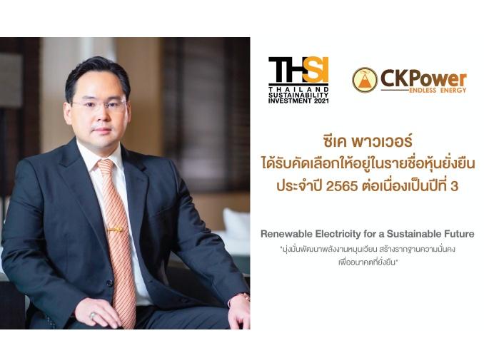 บริษัท ซีเค พาวเวอร์ จำกัด (มหาชน) หรือ CKPower (ชื่อย่อหลักทรัพย์: CKP) ประสบความสำเร็จ ได้รับการคัดเลือกจากตลาดหลักทรัพย์แห่งประเทศไทย เป็น ‘หุ้นยั่งยืน’ประจำปี 2565 หรือ Thailand Sustainability Investment (THSI) ต่อเนื่องเป็นปีที่ 3 ตอกย้ำการดำเนินธุรกิจที่ยั่งยืนและสร้างสมดุลให้กับโลก เพื่อมุ่งสู่เป้าหมายการปล่อยก๊าซเรือนกระจกสุทธิเป็นศูนย์ภายในปี 2593