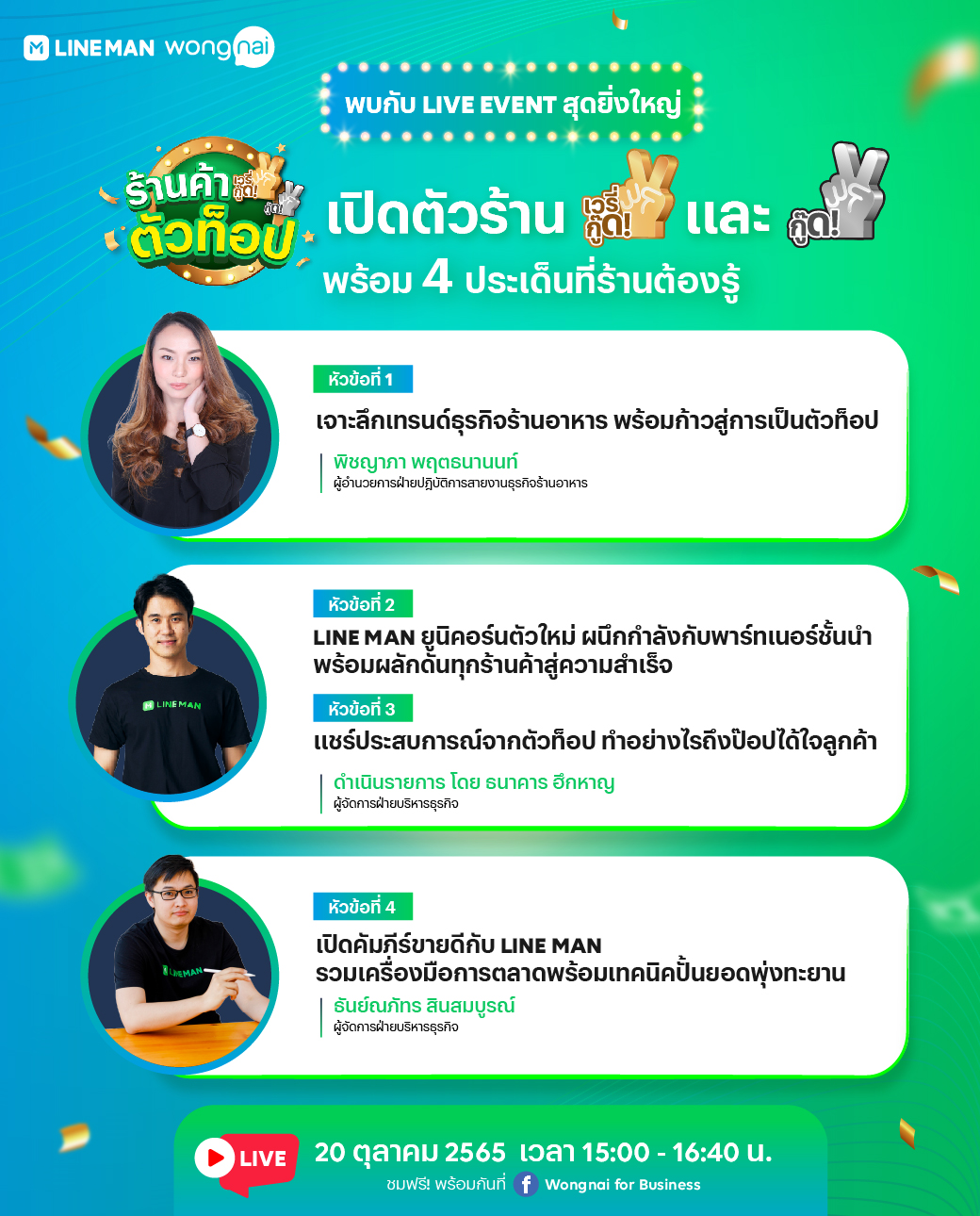 ทั้งนี้ งานสัมมนาออนไลน์ "เปิดตัวร้าน เวรี่กู๊ด! และ กู๊ด! ดันร้านตัวท็อปให้ปังอีกขั้น" ถือเป็นกิจกรรมพิเศษที่มอบให้กับร้านอาหารที่เปิดขายบนแอปพลิเคชัน LINE MAN และร้านค้าที่สนใจ เพื่ออัปสกิลให้กับธุรกิจร้านอาหาร โดยกิจกรรมครั้งนี้จะมาในรูปแบบ LIVE Event ผ่านช่องทางเฟซบุ๊กเพจ Wongnai for Business ในวันที่ 20 ตุลาคม 2565 ตั้งแต่เวลา 15.00 น. โดยภายในงานผู้ประกอบการร้านอาหารจะได้พบกับความรู้ด้านการเจาะลึกเทรนด์ธุรกิจร้านอาหาร แนะนำเทคนิคปั้นร้านให้ประสบความสําเร็จ พร้อมด้วยเรื่องราวประสบการณ์จากร้านอาหารตัวท็อป และพันธมิตรผู้สนับสนุน