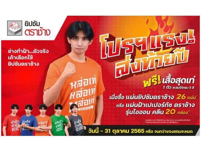 ยิปซัมตราช้าง มอบโปรโมชั่นแรงไฟลุกส่งท้ายปี ฟรี!! เสื้อดีไซน์เท่สวมแล้วให้ความรู้สึกแข็งแกร่งสุดในปฐพี เพียงซื้อแผ่นยิปซัมตราช้าง จำนวน 26 แผ่น หรือ แผ่นฝ้าเปเปอร์ทัช ตราช้าง รุ่นไอออน คลีน จำนวน 20 กล่อง รับเลย เสื้อยืดสุดเท่ มีให้เลือก 5 สี 5 สไตล์ อาทิ “หล่อเท่ ทำฝ้า ตัวจริง งานไว และ จ้างได้” ช่างมืออาชีพตัวจริง ต้องสะสมให้ครบทุกสี ทุกแบบ เริ่มตั้งแต่วันนี้ จนถึง 31 ตุลาคม 2565 หรือจนกว่าของจะหมด