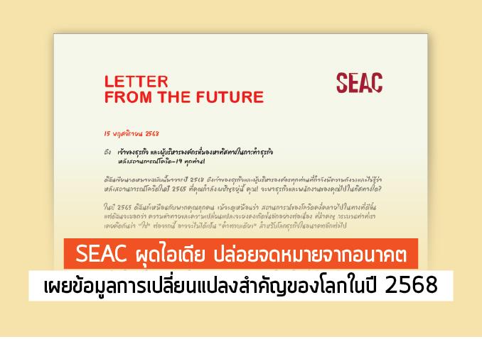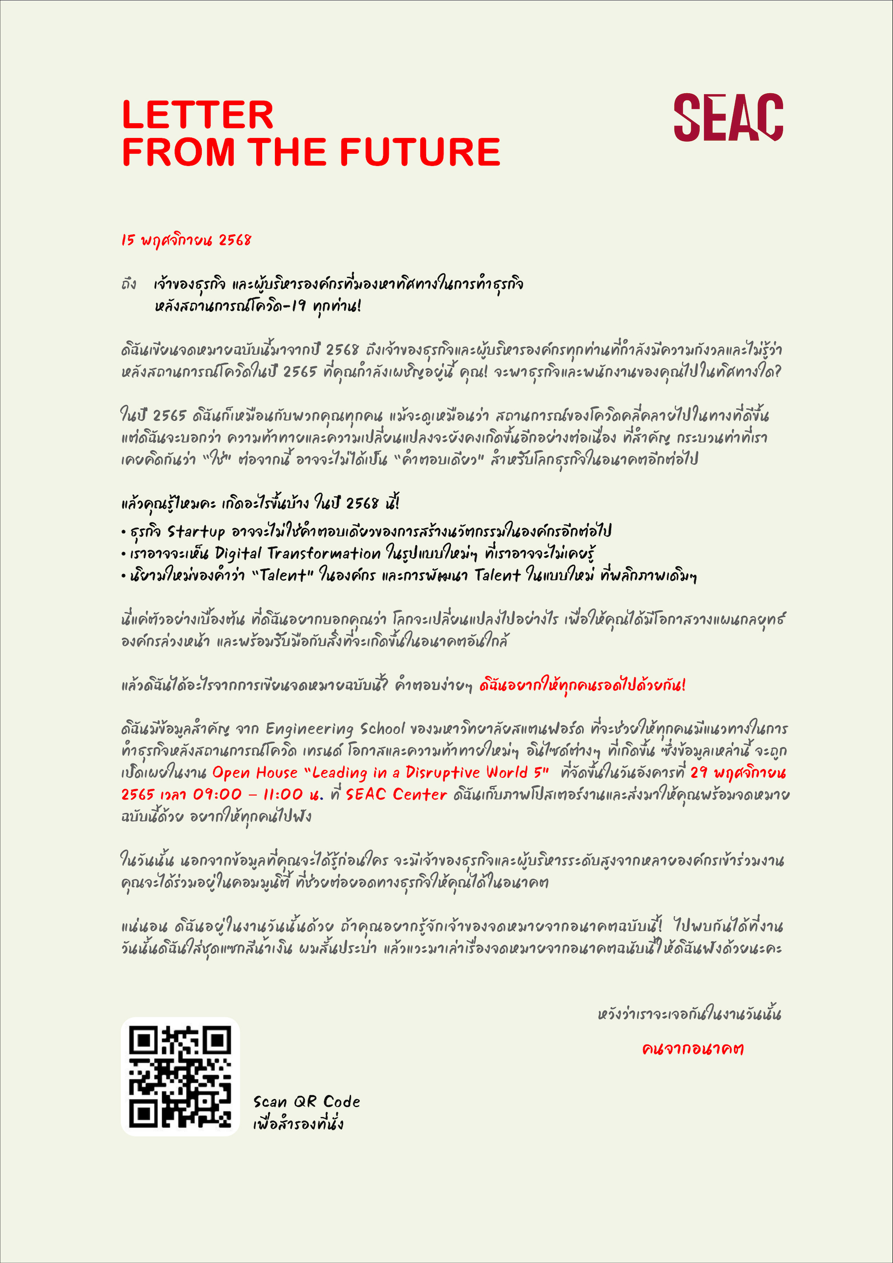 SEAC (ซีแอค) ผู้นำด้านการพัฒนาศักยภาพคนและองค์กรเพื่อส่งเสริมการเรียนรู้ตลอดชีวิต ผุดไอเดียร่อนจดหมายจากอนาคต ลงวันที่ 15 พฤศจิกายน 2568 ย้ำเจ้าของธุรกิจ และผู้บริหารองค์กร ในปีปัจจุบัน ร่วมงาน Open House “Leading in a Disruptive World 5” ที่จัดขึ้นในวันอังคารที่ 29 พฤศจิกายน 2565 เวลา 09:00 – 11:00 น. ที่ SEAC Center เพื่อรับฟังข้อมูลล่วงหน้าจากอนาคตว่าปี 2568 โลกจะเปลี่ยนไปอย่างไร และต้องเตรียมตัวอย่างไรเพื่อรับมือกับการเปลี่ยนแปลงหรือคว้าโอกาสจากสถานการณ์เหล่านั้น