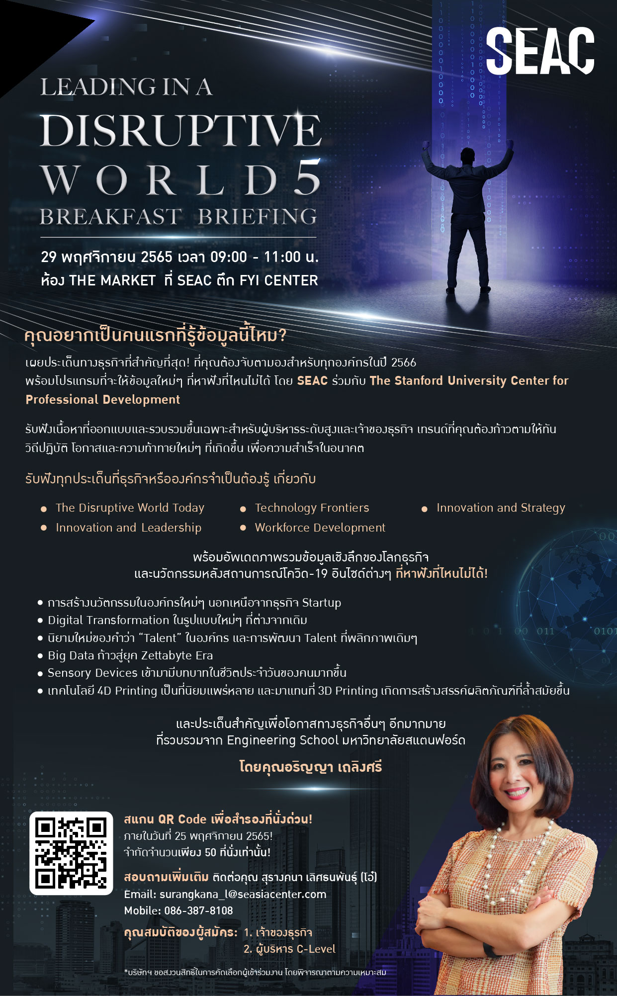 ติดตามรายละเอียดเพิ่มเติมเกี่ยวกับ Open House “Leading in a Disruptive World 5” ได้ที่ Facebook: SEAC หรือ https://www.facebook.com/seasiacenter