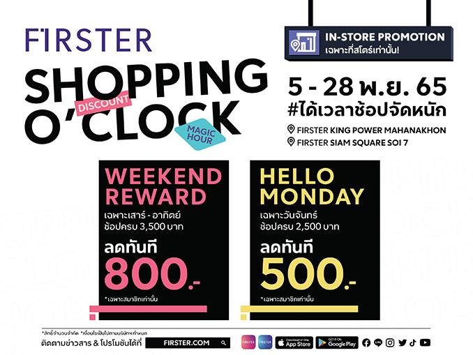 FIRSTER (เฟิร์สเตอร์) มัลติแพลตฟอร์มแห่งการช้อปปิ้งสินค้าบิวตี้และไลฟ์สไตล์ไอเทม จาก คิง เพาเวอร์ จัดแคมเปญ “FIRSTER SHOPPING O’CLOCK #ได้เวลาช้อปจัดหนัก” ตั้งแต่วันนี้ถึง 28 พฤศจิกายน 2565 ที่ FIRSTER คิง เพาเวอร์ มหานคร และสยามสแควร์ ซอย 7