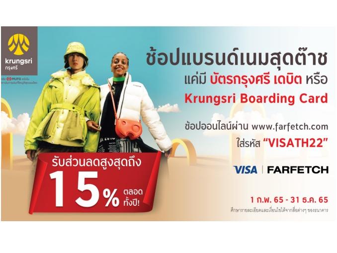 กรุงศรี (ธนาคารกรุงศรีอยุธยา จำกัด (มหาชน)) ในเครือของมิตซูบิชิ ยูเอฟเจ ไฟแนนเชียล กรุ๊ป (MUFG) หนึ่งในกลุ่มสถาบันการเงินที่ใหญ่ที่สุดระดับโลก ชวนมาช้อปสินค้าแบรนด์หรูส่งท้ายปีกันอย่างจุใจด้วยโปรโมชัน “ช้อปแบรนด์เนมสุดต๊าซ” เฉพาะลูกค้ากรุงศรีได้เพลิดเพลินกับการช้อปปิ้งสินค้าระดับไฮเอนด์ ด้วยส่วนลดสูงสุด 15% เพียงช้อปผ่าน www.farfetch.com และชำระด้วยด้วยบัตรกรุงศรี เดบิต หรือ Krungsri Boarding Card และใส่รหัส “VISATH22” โปรสุดต๊าซแห่งปีเริ่มแล้ววันนี้ – 31 ธันวาคม 2565