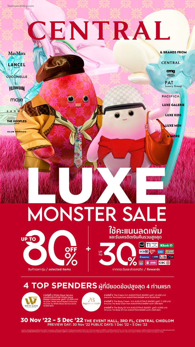 คนแบรนด์เนมปักวันรอช้อปได้เลย ที่งาน “Central Luxe Monster Sale 2022” ห้างเซ็นทรัลชิดลม หรือ ช้อปสะดวกทุกที่ ทุกเวลา ผ่านช่องทางช้อปปิ้งสุดพิเศษที่ Central App, เว็บไซต์ www.central.co.th, Central Chat & Shop ช้อปและแชตผ่านไลน์ @Centralofficial, บริการ Central Call & Shop และบริการ Central Personal Shopper On Demand โทร.1425