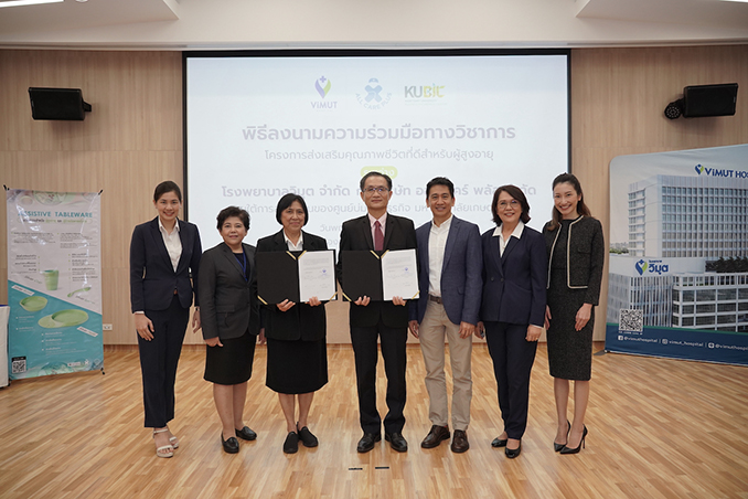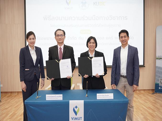 โรงพยาบาลวิมุต นำโดย นพ.สมศักดิ์ อรรฆศิลป์ ประธานเจ้าหน้าที่บริหาร บริษัท โรงพยาบาลวิมุต โฮลดิ้ง จำกัด ร่วมลงนามบันทึกข้อตกลงความร่วมมือกับ บริษัท ออล แคร์ พลัส จำกัด ภายใต้การสนับสนุนของศูนย์บ่มเพาะธุรกิจ มหาวิทยาลัยเกษตรศาสตร์ โดยมี ดร.ภัทรารัตน์ ตันนุกิจ ประธานกรรมการ บริษัท ออล แคร์ พลัส จำกัด และที่ปรึกษา รศ.ดร.สิงห์ อินทรชูโต หัวหน้าศูนย์สร้างสรรค์การออกแบบเพื่อสิ่งแวดล้อม คณะสถาปัตยกรรมศาสตร์ มหาวิทยาลัยเกษตรศาสตร์