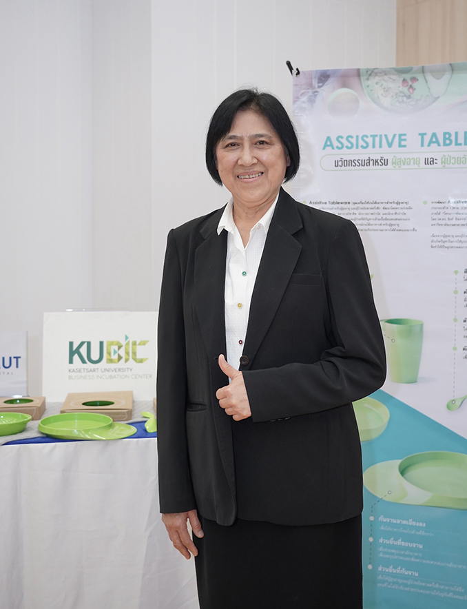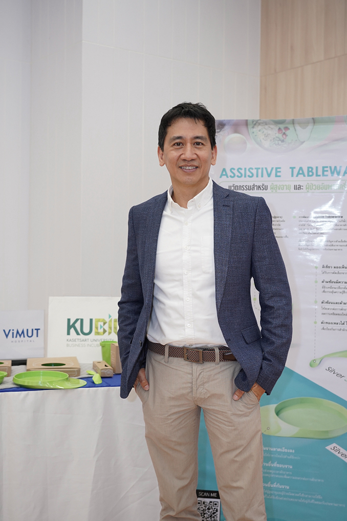 “ชุดภาชนะสำหรับผู้สูงอายุหรือผู้ป่วยที่มีปัญหากล้ามเนื้ออ่อนแรงชุดนี้ผ่านการออกแบบมาอย่างพิถีพิถัน และใส่ใจในทุกๆ รายละเอียดการใช้งานจริง ยกตัวอย่างเช่นการออกแบบจานจะมีก้นจานที่ลาดเอียงเพื่อให้อาหารไหลไปด้านที่ลึกกว่า ส่วนขอบจานจะเอียงเช่นกัน แต่เป็นด้านตรงข้ามกับส่วนที่ลึกของก้นจาน เพื่อเพิ่มความสะดวกในการตักอาหาร ก้นจานออกแบบให้มีส่วนยื่นออกทางด้านข้าง เพื่อให้ผู้สูงอายุสามารถใช้มือที่ไม่ได้จับช้อนช่วยประคองจานให้อยู่กับที่ในขณะรับประทานอาหาร หรือการออกแบบแก้วน้ำที่สอดรับกับขนาดของมือ โดยออกแบบให้ก้นแก้วสูงขึ้นเพื่อลดปริมาณน้ำในแก้วไม่ให้มากเกินไป ป้องกันการสำลัก และขอบแก้วมีส่วนยื่นเพื่อให้อุ้งมือสามารถพยุงแก้วได้ง่ายและกระชับขึ้น บริเวณตัวแก้วไม่ให้มีรอยเว้า เพื่อแก้ปัญหาการจับแก้วผิดด้าน เหล่านี้เกิดจากการวิจัยและพัฒนามาอย่างยาวนาน เพื่อให้ผลิตภัณฑ์มีความสอดคล้องกับสรีรวิทยาของผู้สูงอายุและผู้ป่วยชาวไทยมากที่สุด”
