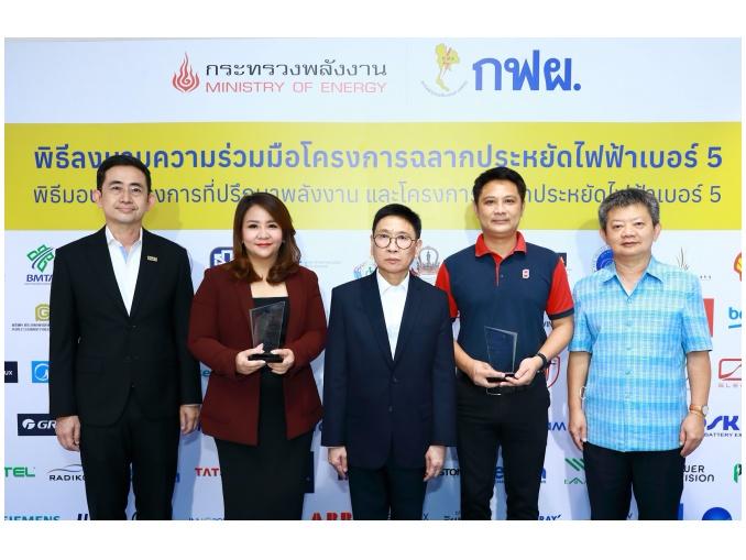 โดยมีนางสาวภัคสภัสษ์ ตลอดสุขดีนนท์ (ที่ 2 จากซ้าย) ผู้อำนวยการอาวุโส เป็นตัวแทนเข้ารับมอบโล่จากนายกุลิศ สมบัติศิริ (กลาง) ปลัดกระทรวงพลังงาน และประธานกรรมการ กฟผ.ในพิธีมอบโล่แก่ผู้เข้าร่วมโครงการบ้านเบอร์ 5 และอาคารเบอร์ 5 ณ กฟผ.