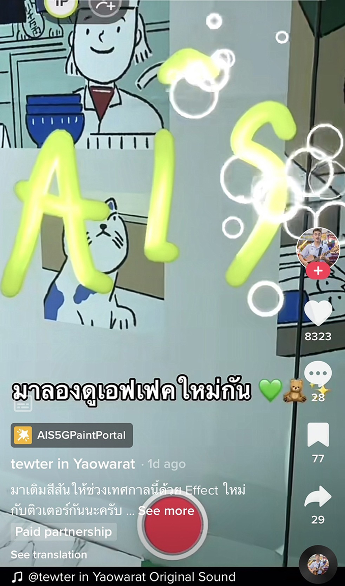 AIS 5G ปล่อยแคมเปญส่งท้ายปลายปี เอาใจติ๊กต๊อกเกอร์ กับภารกิจ #AIS5GPaintChallenge ชวนชาว TikTok ครีเอเตอร์ มาเพิ่มประสบการณ์ความพิเศษให้การทำคอนเทนต์มีความแปลกใหม่ไม่เหมือนใคร ด้วยการทำงานร่วมกับ TikTok เปิดตัวเอฟเฟค AIS 5G Paint Portal ครั้งแรกในวงการเทเลคอมที่ให้ทุกคนได้สนุกไปกับการใช้แปรงจากเทคโนโลยี AR มาระบายสีและดีไซน์การทำคอนเทนต์บนแพลตฟอร์ม TikTok
