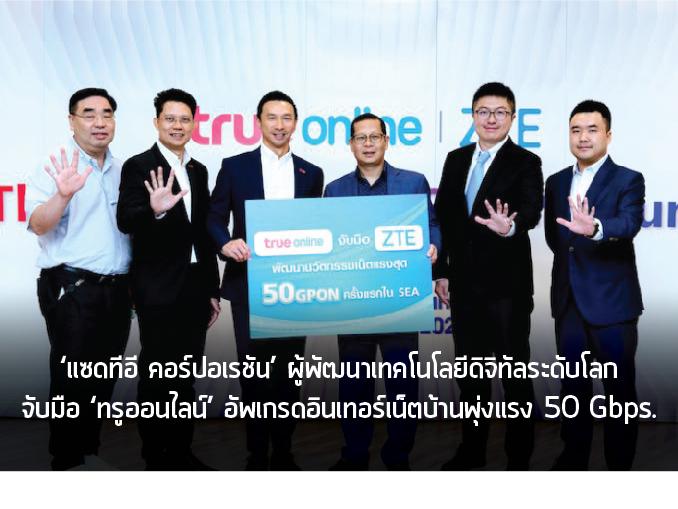 แซดทีอี คอร์ปอเรชัน ผู้พัฒนาเทคโนโลยีดิจิทัลระดับโลก เปิดตัวอุปกรณ์ GPON ร่วมกับ ทรูออนไลน์ ผู้ให้บริการอินเทอร์เน็ตบ้านอันดับหนึ่ง ได้รับรางวัล World Branding Awards 6 ปีซ้อน และ nPerf 2 ปีซ้อน โดยได้รับความไว้วางใจจากคนไทยมากที่สุด จับมือกันพัฒนานวัตกรรมอินเทอร์เน็ตบ้าน อัพเกรดความเร็วให้แรงสุดล้ำ 50 Gbps. ผ่านอุปกรณ์ GPON [Gigabit Passive Optical Network] เทคโนโลยีแห่งอนาคต ที่มีค่าแบนด์วิธและประสิทธิภาพสูง มุ่งพลิกบริการเครือข่ายในการเข้าถึงบรอดแบนด์และการขยายตัวภาคธุรกิจ รองรับการใช้งานทีวีระบบ 8K Ultra HDTV, 8K Cloud VR, VR Pro 360, AR Pro และ Metaverse รวมถึงแอปพลิเคชันที่ต้องการความคมชัดสูง สามารถตอบสนองไลฟ์สไตล์ผู้บริโภคยุคดิจิทัลอย่างแท้จริง ทั้งนี้ ผลการทดสอบพบว่าความเร็ว ดาวน์โหลด 43.90 Gbps.และ อัปโหลด 21.30 Gbps. นับเป็นครั้งแรกในเอเชียตะวันออกเฉียงใต้