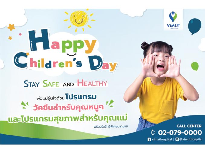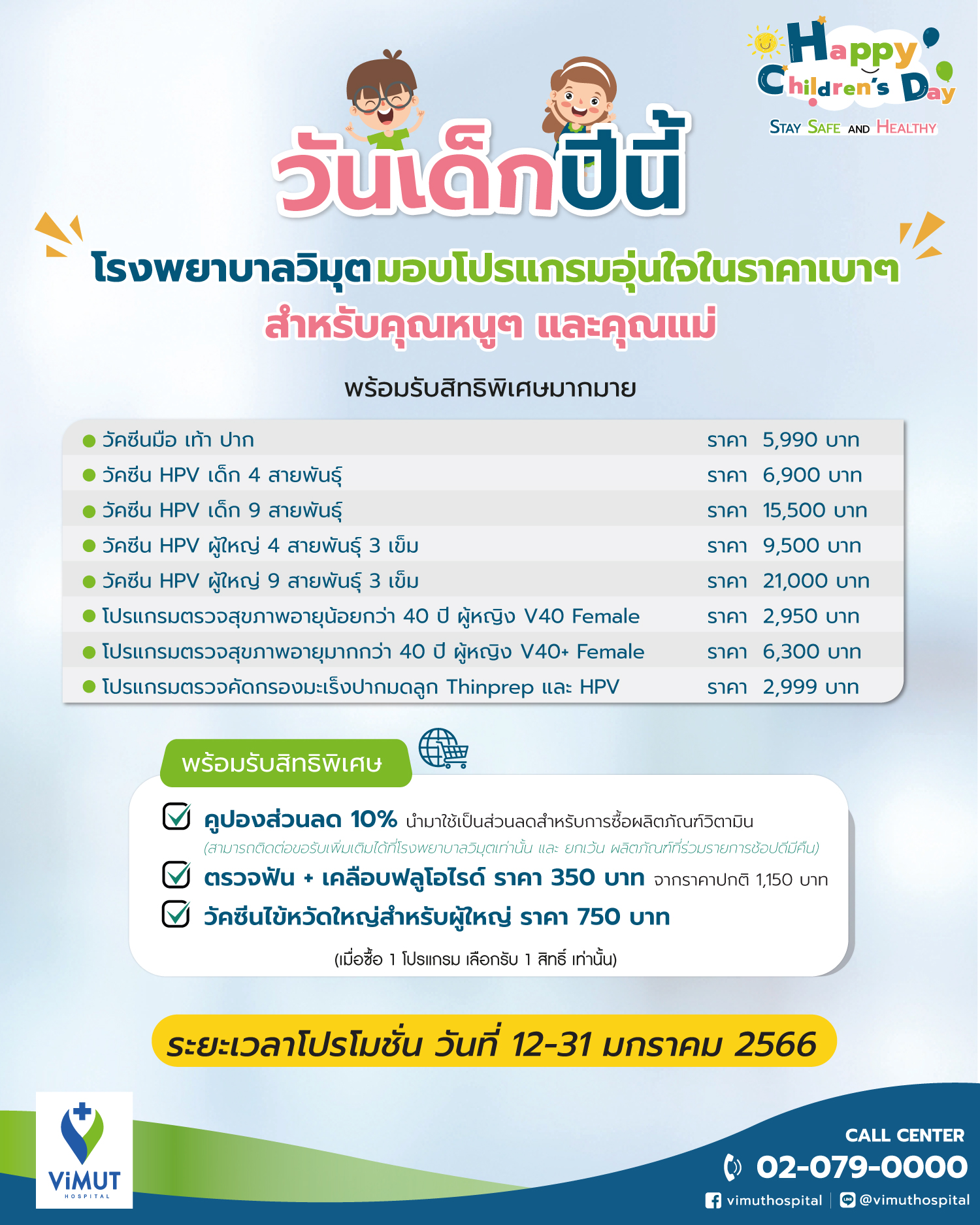 โรงพยาบาลวิมุต จัดแคมเปญต้อนรับวันเด็ก “STAY SAFE AND HEALTHY” ชวนคุณแม่และหนูๆ จับมือกันมาตรวจสุขภาพและรับวัคซีนในราคาสุดคุ้มกับ 7 แพ็กเกจหลัก โดยเน้นบริการวัคซีนป้องกันโรคมือเท้าปากและไวรัส HPV รวมถึงแพ็กเกจตรวจสุขภาพสำหรับสตรีในทุกช่วงวัย เพื่อให้ทั้งคุณแม่และคุณลูกมีสุขภาพดีต้อนรับปีใหม่อย่างสดใส พร้อมก้าวไปใช้ชีวิตที่สนุกสนานด้วยกันอย่างเต็มที่ เปิดให้ผู้สนใจสามารถติดต่อซื้อแพ็กเกจในแคมเปญ “STAY SAFE AND HEALTHY” ได้แล้วตั้งแต่วันนี้ – 31 มกราคม 2566 ที่โรงพยาบาลวิมุต หรือติดต่อ โทร. 02-079-0000
