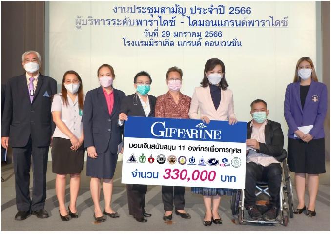 แพทย์หญิงนลินี ไพบูลย์ ประธานกรรมการ บริษัท กิฟฟารีน สกายไลน์ ยูนิตี้ จำกัด มอบเงินสนับสนุน 11 องค์กรการกุศล เป็นจำนวนเงิน 330,000 บาท เพื่อคืนกำไรให้สังคม และช่วยเหลือองค์กรการกุศลต่างๆ ที่ดูแลผู้ด้อยโอกาส โดยมีผู้แทนจากมูลนิธิต่างๆ ได้แก่ คุณเกรียงฤทธิ์ สุขเจริญสิน มูลนิธิขาเทียมฯ คุณแสงหยก จันทร์มั่นคง มูลนิธิช่วยคนตาบอดแห่งประเทศไทยฯ คุณอัญชลีย์ ชูตระกูล มูลนิธิบ้านบางแค และคุณสุริยา สมสีลา มูลนิธิเพื่อเด็กพิการ เข้ารับมอบ ณ โรงแรม มิราเคิล แกรนด์ คอนเวนชั่น เมื่อเร็วๆ นี้