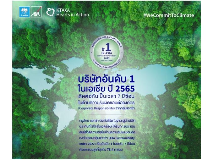 บมจ.กรุงไทย-แอกซ่า ประกันชีวิต ในฐานะผู้นำบริษัทประกันที่ใส่ใจสิ่งแวดล้อม หรือ Green Insurer คว้าอันดับ 1 ในเอเชีย 7 ปีซ้อน ด้านความรับผิดชอบต่อองค์กร (CR) จากการประเมินดัชนีชี้วัดความยั่งยืนด้านความรับผิดชอบต่อองค์กรของกลุ่มแอกซ่า (AXA Sustainability Index 2022) ด้วยคะแนนสูงสุดในเอเชียถึง 78.43 คะแนน ซึ่งถือเป็นอีกหนึ่งความภาคภูมิใจ ในฐานะผู้นำด้านบริษัทประกันที่ใส่ใจสิ่งแวดล้อม “Green Insurer” และเป็นการตอกย้ำจุดยืนของบริษัทฯ ในการสนับสนุนให้ทุกคนร่วมกันเป็นแรงขับเคลื่อนสำคัญในการใส่ใจสิ่งแวดล้อม และเป็นส่วนหนึ่งของการช่วยฟื้นฟูระบบนิเวศน์ และความหลากหลายทางชีวภาพในทะเล โดยบริษัทฯ มุ่งมั่นในการช่วยเหลือสังคม และสิ่งแวดล้อมอย่างยั่งยืนตลอดมา พร้อมอยู่เคียงข้างทุกความเชื่อมั่น ดูแลกันตลอดไป