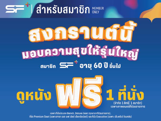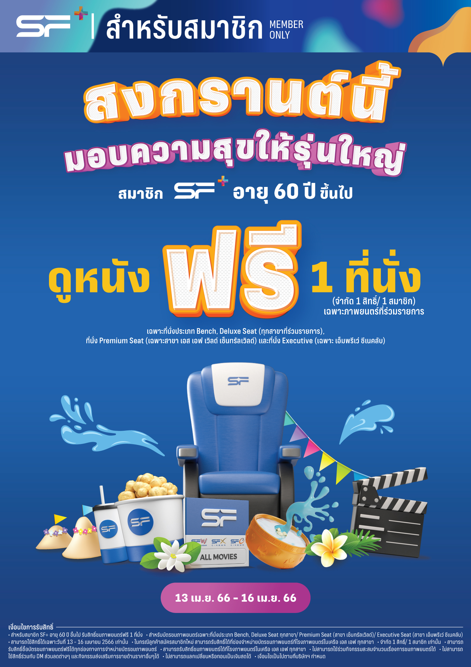 โรงภาพยนตร์ในเครือ เอส เอฟ ต้อนปีใหม่ไทยสงกรานต์ 2023 ให้สมาชิก SF+ ที่มีอายุ 60 ปีขึ้นไป รับทันทีสิทธิ์ชมภาพยนตร์ฟรี 1 ที่นั่ง (สำหรับภาพยนตร์ที่ร่วมรายการ) ไม่จำกัดจำนวนสิทธิ์