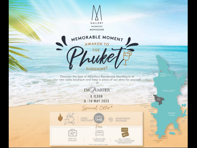 มอนท์เอซัวร์ ภูเก็ต (MontAzure Phuket) ผู้พัฒนาโครงการเรสซิเดนเชียลรีสอร์ตระดับลักซ์ชัวรีบนทำเลพรีเมียมติดชายหาดกมลา บนเกาะภูเก็ต จัดอีเวนต์สุดพิเศษ “Memorable Moment – Awaken to the Phuket Sunshine” บริเวณชั้น G ศูนย์การค้าดิเอ็มควอเทียร์ ตั้งแต่วันที่ 8-14 พฤษภาคม 2566 เปิดโอกาสการลงทุนครั้งสำคัญเพื่อนักลงทุนและผู้ที่มองหาโครงการอสังหาฯ ระดับลักซ์ชัวรีกับโครงการเอ็มแกลเลอรี เรสซิเดนซ์ มอนท์เอซัวร์ (MGallery Residences MontAzure)