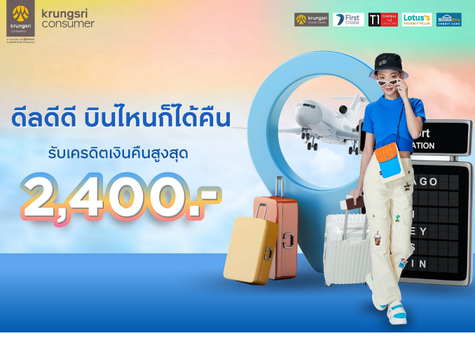 บัตรเครดิตในเครือกรุงศรี คอนซูมเมอร์ ชวนออกท่องโลกกว้างกับ 7 สายการบินชั้นนำ ได้แก่ แอร์เอเชีย, บางกอกแอร์เวย์ส, นกแอร์, ไทยไลอ้อนแอร์, ไทยสมายล์, ไทยเวียตเจ็ท และพีชแอร์ พร้อมรับเครดิตเงินคืนสุดคุ้ม สูงสุด 2,400 บาท ตั้งแต่ 1 พฤษภาคม – 31 สิงหาคม 2566 เพียงชำระค่าบัตรโดยสารผ่านบัตรเครดิต กรุงศรี, บัตรกรุงศรีเฟิร์สช้อยส์, บัตรเครดิตเซ็นทรัล เดอะวัน, บัตรเครดิตโลตัส หรือบัตรเครดิต โฮมโปร วีซ่า
