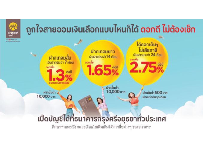 กรุงศรี (ธนาคารกรุงศรีอยุธยา จำกัด (มหาชน)) จัดแคมเปญเงินฝาก เอาใจสายออม เลือกแบบไหนก็ได้ ดอกดี ไม่ต้องเช็ก เมื่อเปิดบัญชีเงินฝากประจำที่ธนาคารกรุงศรีอยุธยา ทั่วประเทศ
