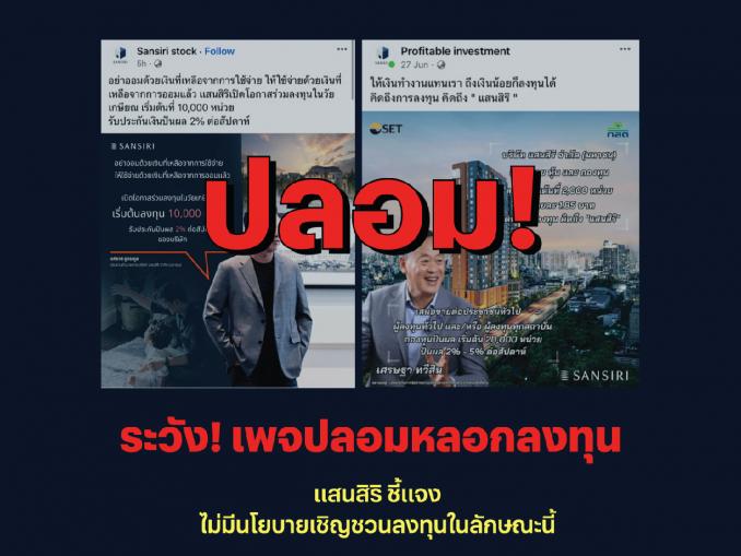 แสนสิริ แจ้งเตือนเพจเฟซบุ๊คแอบอ้างใช้ภาพอดีตผู้บริหาร และโลโก้บริษัทไปใช้หลอกลวงชักชวนคนให้ลงทุนในการเทรดหุ้น ผ่านเพจเฟซบุ๊คหลากหลายเพจในช่วงเวลานี้