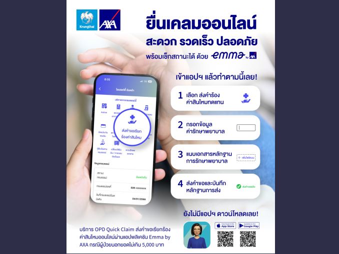 บมจ.กรุงไทย-แอกซ่า ประกันชีวิต ตอกย้ำการเป็นผู้นำด้านดิจิทัล เปิดตัวฟีเจอร์ใหม่ ‘บริการเคลมออนไลน์’ (OPD Quick Claim) บนแอปพลิเคชัน Emma by AXA เพื่อช่วยให้การเบิกเงินค่าสินไหมสะดวกและรวดเร็วขึ้น สำหรับลูกค้าประกันชีวิตที่มีผลประโยชน์ความคุ้มครองกรณีรักษาผู้ป่วยนอก และมียอดสำรองจ่ายเงินค่ารักษาพยาบาลไม่เกิน 5,000 บาท โดยสถานะการเคลมสามารถตรวจสอบได้ตลอดเวลา และเมื่อสินไหมได้รับการอนุมัติ เงินจะถูกโอนเข้าบัญชีธนาคารภายใน 3-5 วันทำการ