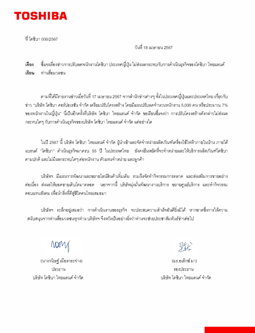ตามที่ได้มีรายงานข่าวเมื่อวันที่ 17 เมษายน 2567 จากสำนักข่าวต่างๆ ทั้งในประเทศญี่ปุ่นและประเทศไทย เกี่ยวกับข่าว “บริษัท โตชิบา คอร์ปอเรชัน จำกัด เตรียมปรับโครงสร้าง โดยมีแผนปรับลดจำนวนพนักงาน 5,000 คน หรือประมาณ 7% ของพนักงานในญี่ปุ่น” นี่เป็นอีกครั้งที่บริษัท โตชิบา ไทยแลนด์ จำกัด ขอเรียนชี้แจงว่า การปรับโครงสร้างดังกล่าวไม่ส่งผลกระทบใดๆ กับการดำเนินธุรกิจของบริษัท โตชิบา ไทยแลนด์ จำกัด แต่อย่างใด