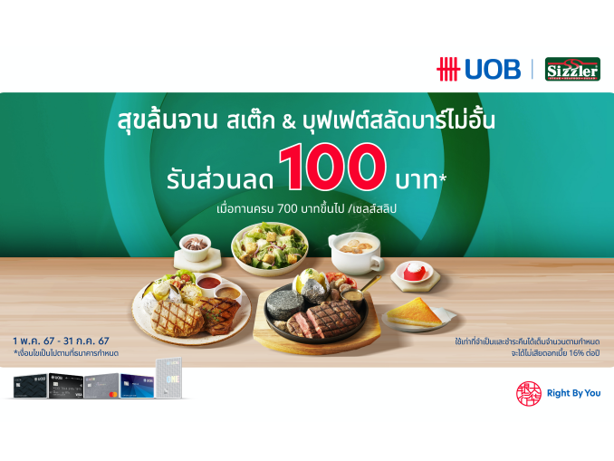 ธนาคารยูโอบี ประเทศไทย จับมือ ซิซซ์เล่อร์ (Sizzler) ร้านสเต๊กและสลัดบาร์ชื่อดังของไทย จัดโปรโมชันพิเศษ ชวนเหล่านักชิม สายกิน มาอร่อยสุดคุ้ม ทุกเมนูในร้านที่ Sizzler ทุกสาขา รับส่วนลด 100 บาท สำหรับลูกค้าบัตรเครดิต UOB เมื่อมียอดใช้จ่ายตั้งแต่ 700 บาทขึ้นไป ต่อเซลล์สลิป (หลังหักส่วนลดทุกประเภท และเฉพาะรับประทานที่ร้านเท่านั้น) ณ ร้านซิซซ์เล่อร์ ทุกสาขาทั่วประเทศ ระหว่างวันนี้ –31 กรกฎาคม 2567 ชวนทุกคนมาร่วมอิ่มอร่อย สุดคุ้ม กับโปรโมชันสุดพิเศษ หลากหลายประเภทอาหารที่พร้อมตอบโจทย์ลูกค้าแล้ววันนี้