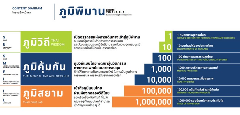 100 สิ่งสร้างไทยให้เป็นศูนย์กลางการแพทย์โลกเพื่อส่งมอบสุขภาพที่ดี พร้อมสร้างความเชื่อมั่นด้วยศักยภาพสาธารณสุขไทยทั้ง 4 ด้านที่จะขับเคลื่อนให้ไทยกลายเป็นศูนย์กลางบริการสุขภาพของโลก (Medical Hub) ได้แก่ Medical Service Hub, Wellness Hub, Product Hub, Academic Hub รวมถึงพืชสมุนไพร Herbal Champion ที่สามารถยกระดับให้ไทยเป็นดินแดนที่พร้อมดูแลและปกป้องทุกชีวิตได้ในอนาคต