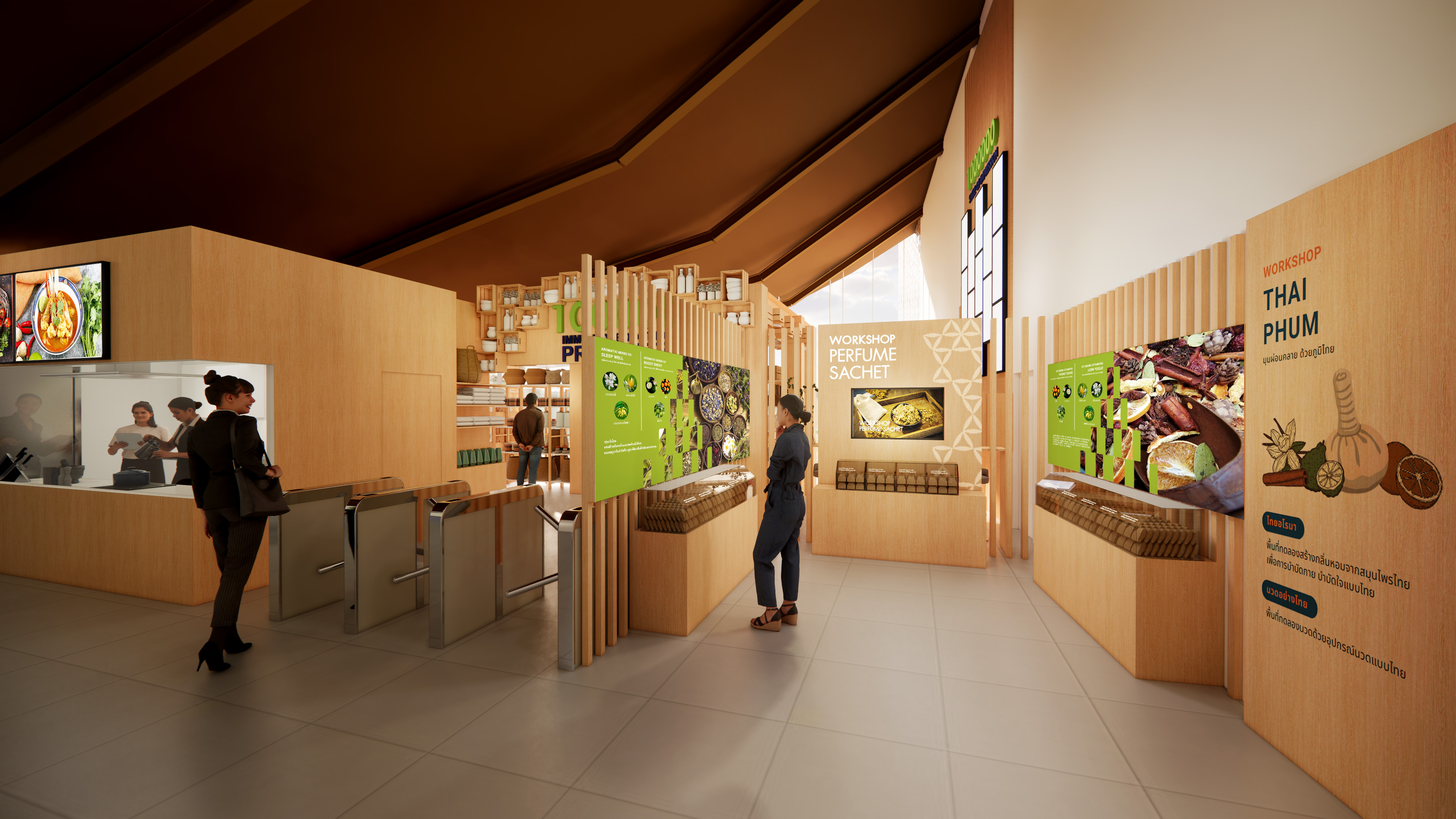 พื้นที่จำหน่ายผลิตภัณฑ์เสริมภูมิจากประเทศไทย ทั้งเครื่องแต่งกาย ของแต่งบ้าน อาหารและเครื่องดื่ม สินค้าที่ระลึก รวมถึงโปรแกรมท่องเที่ยวเพื่อสุขภาพ ที่ทุกคนล้วนเข้าถึงสุขภาพดี ในแบบไทยๆได้