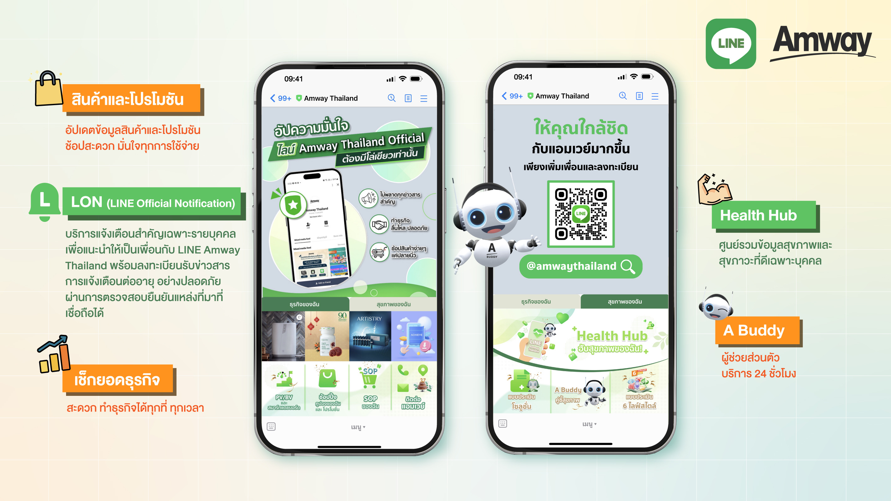 ล่าสุด แอมเวย์ ยกระดับการมอบประสบการณ์การสื่อสารและช้อปปิ้งที่สะดวก ปลอดภัย ครบครัน ไปอีกขั้น ได้ร่วมมือกับ LINE ประเทศไทย อัปเกรดศักยภาพช่องทางการสื่อสารและช้อปปิ้งผ่านบัญชี Amway Thailand Official Account เพื่อสร้างความมั่นใจให้กับผู้ใช้งานอย่างครบวงจรในการทำธุรกรรมการใช้จ่ายบนแอปฯ ด้วยระบบการจ่ายเงินผ่านเกตเวย์ที่มีความปลอดภัยสูง พร้อมเปิดใช้งานโซลูชันใหม่ LINE Official Notification หรือ LON ระบบการแจ้งเตือนผ่าน Amway Thailand Official Account อำนวยความสะดวกให้ผู้ใช้ใหม่ที่เพิ่งสมัครเป็นนักธุรกิจ/สมาชิกแอมเวย์ ในการลงทะเบียนรับบริการต่างๆ จากแอมเวย์ได้อย่างรวดเร็ว ทันใจ และแจ้งเตือนสถานะการต่ออายุสมาชิกให้อย่างครบครัน ยกระดับการสื่อสารข้อมูลสำคัญสู่สมาชิกให้ทันสมัย ปลอดภัย ไร้ข้อกังวลเรื่องมิจฉาชีพผ่านข้อความ SMS โดยผู้ใช้งาน LINE ของแอมเวย์ สามารถสังเกตไอคอน ‘โล่สีเขียว’ ที่ได้การรับรองสำหรับบัญชีของ แอมเวย์ประเทศไทย อย่างเป็นทางการ และยังสามารถค้นหาบัญชีของแอมเวย์ได้ง่ายดายยิ่งขึ้น พร้อมสนุกไปกับฟีเจอร์ที่หลากหลาย เพื่อเสริมประสบการณ์การใช้งาน LINE อย่างเหนือระดับ เช่น
