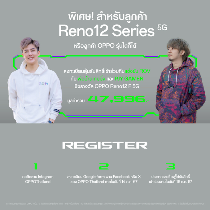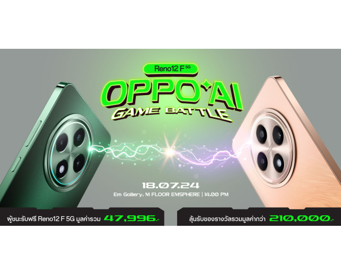 ในครั้งนี้ OPPO จัดหนักจัดเต็ม เอาใจแฟนๆ ออปโป้ ชวนเหล่าเกมเมอร์มาร่วมทดสอบประสิทธิภาพของ OPPO Reno12 F 5G OPPO AI Phone สุดล้ำที่เชื่อมต่อกับสัญญาณได้อย่างเสถียรและรวดเร็วด้วย AI LinkBoost มาพร้อมจอแสดงผลปรับอัจฉริยะ 120Hz มอบประสบการณ์การเล่มเกมแบบจัดเต็ม หน่วยความจำจุใจด้วย RAM 12GB + 256GB เสริมด้วยลำโพงคู่มอบเสียงกระหึ่ม และ Holo Audio เล่นเกมได้เต็มที่ไม่ขาดตอนด้วยแบตเตอรี่ขนาดใหญ่ 5,000mAh มาพร้อมชาร์จไว 45W SUPERVOOC ช่วยให้เล่นเกมได้ไหลลื่นไม่มีสะดุดเต็มอรรถรส ผ่านศึกแห่งการดวลเดือดในเกม RoV ร่วมเล่นเข้าร่วมทีมกับเหล่าเกมเมอร์ชื่อดังอย่าง PB Gaming - พ่อบ้านเกมมิ่ง และ PJY GAMER แฟนๆ OPPO เตรียมตัวให้พร้อม เพราะผู้ชนะการแข่งขันนี้จะได้รับรางวัลใหญ่สุดพิเศษ OPPO Reno12 F 5G มูลค่ารวม 47,996 บาท และยังไม่หมด ยังมีของรางวัลอื่นๆ อีกมากมาย รวมมูลค่ากว่า 210,000 บาท รอให้ผู้โชคดีได้ลุ้นรับ