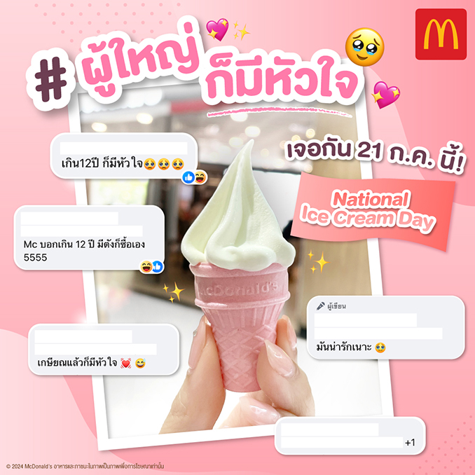 แมคโดนัลด์ ร่วมเฉลิมฉลองวันไอศกรีมสากล (National Ice Cream Day) มอบรอยยิ้มให้กับลูกค้าทุกท่าน ด้วยไอศกรีมมินิโคนชมพูฟรี! เมื่อซื้ออาหารของแมคโดนัลด์ที่สาขาใดก็ได้ ไม่มีกำหนดยอดขั้นต่ำ รับทันทีไอศกรีมมินิโคนชมพู1 โคนต่อใบเสร็จ (จำกัดจำนวน 300 โคน/สาขา)