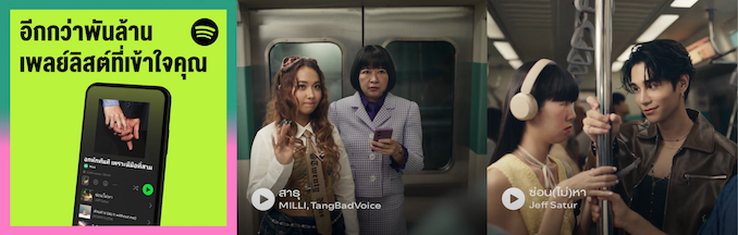 Spotify เปิดตัวแคมเปญ “อีกกว่าพันล้านเพลย์ลิสต์ที่เข้าใจคุณ” ร่วมกับศิลปินแห่งยุคอย่าง Jeff Satur และ MILLI ที่บอกเล่าถึงทุกช่วงเวลาที่เราควรมีเพลงประกอบโมเมนต์ของตัวเอง ไม่ว่าจะเป็นตอนบังเอิญเจอเจ้านายบนรถไฟฟ้า หรือ เผลอไปแตะมือคนแปลกหน้าบนรถไฟฟ้าก็ตาม ความคิดสร้างสรรค์เหล่านี้สะท้อนผ่านการตั้งชื่อเพลย์ลิสต์ตลก ๆ ของคนไทย เช่น ลาป่วยไม่พอต้องลาออก หรือ อกหักทันทีเพราะมีมือที่สาม ซึ่งเพลย์ลิสต์เหล่านี้แสดงให้เห็นถึงอารมณ์ ความรู้สึกที่หลากหลายในแต่ละโมเมนต์ของผู้ฟังที่แตกต่างกัน