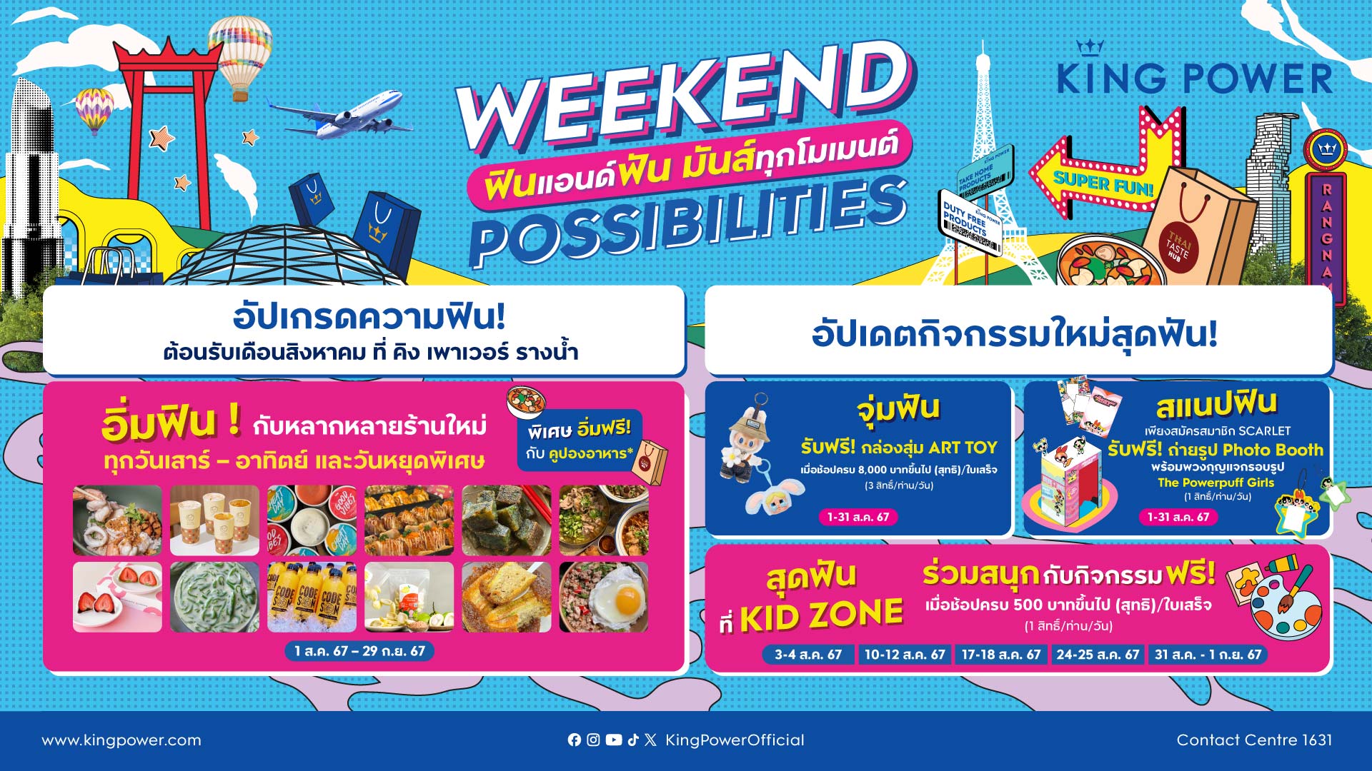 พลาดไม่ได้ ร่วมฟินแอนด์ฟัน มันส์ทุกโมเมนต์กับงาน “WEEKEND POSSIBILITIES” ตั้งแต่วันนี้-29 ก.ย.67 ที่ คิง เพาเวอร์ รางน้ำ ติดตามรายละเอียดเพิ่มเติมได้ที่ https://member.kingpower.com/Promotions/Detail/7589