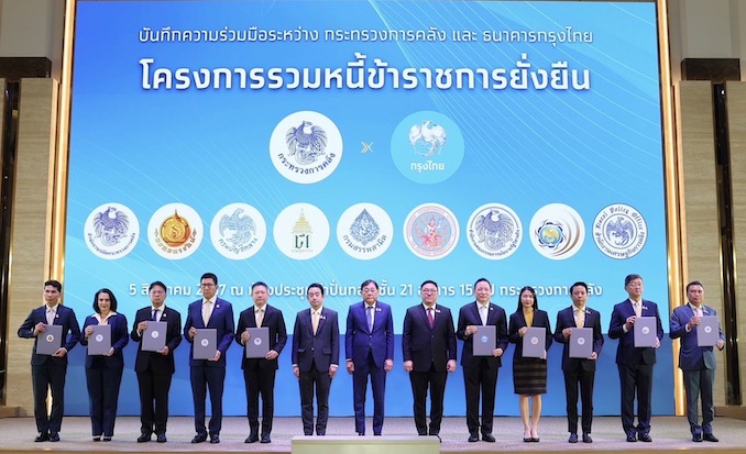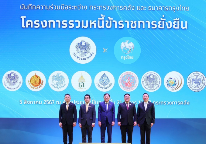 เมื่อวันที่ 5 สิงหาคม 2567 นายพิชัย ชุณหวชิร รองนายกรัฐมนตรีและรัฐมนตรีว่าการกระทรวงการคลัง เป็นประธานพิธีลงนามความร่วมมือใน “โครงการสินเชื่อรวมหนี้ข้าราชการยั่งยืน หน่วยงานในสังกัดกระทรวงการคลัง” โดยมีนายจุลพันธ์ อมรวิวัฒน์ รัฐมนตรีช่วยว่าการกระทรวงการคลัง และนายเผ่าภูมิ โรจนสกุล รัฐมนตรีช่วยว่าการกระทรวงการคลัง ให้เกียรติเป็นสักขีพยานความร่วมมือระหว่างธนาคารกรุงไทย และกระทรวงการคลังโดย 9 หน่วยงานในสังกัด