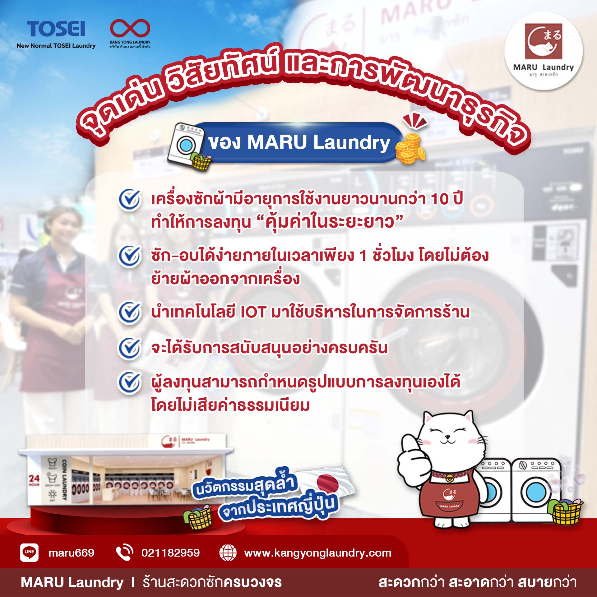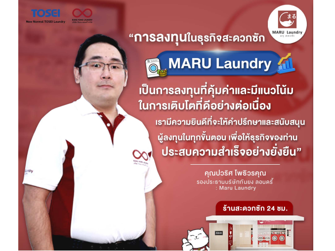 “การลงทุนในธุรกิจสะดวกซัก MARU Laundry เป็นการลงทุนที่คุ้มค่าและมีแนวโน้มในการเติบโตที่ดีอย่างต่อเนื่อง เรามีความยินดีที่จะให้คำปรึกษาและสนับสนุนผู้ลงทุนในทุกขั้นตอน เพื่อให้ธุรกิจของท่านประสบความสำเร็จอย่างยั่งยืน” นายปวริศ โพธิวรคุณ กล่าวเสริม