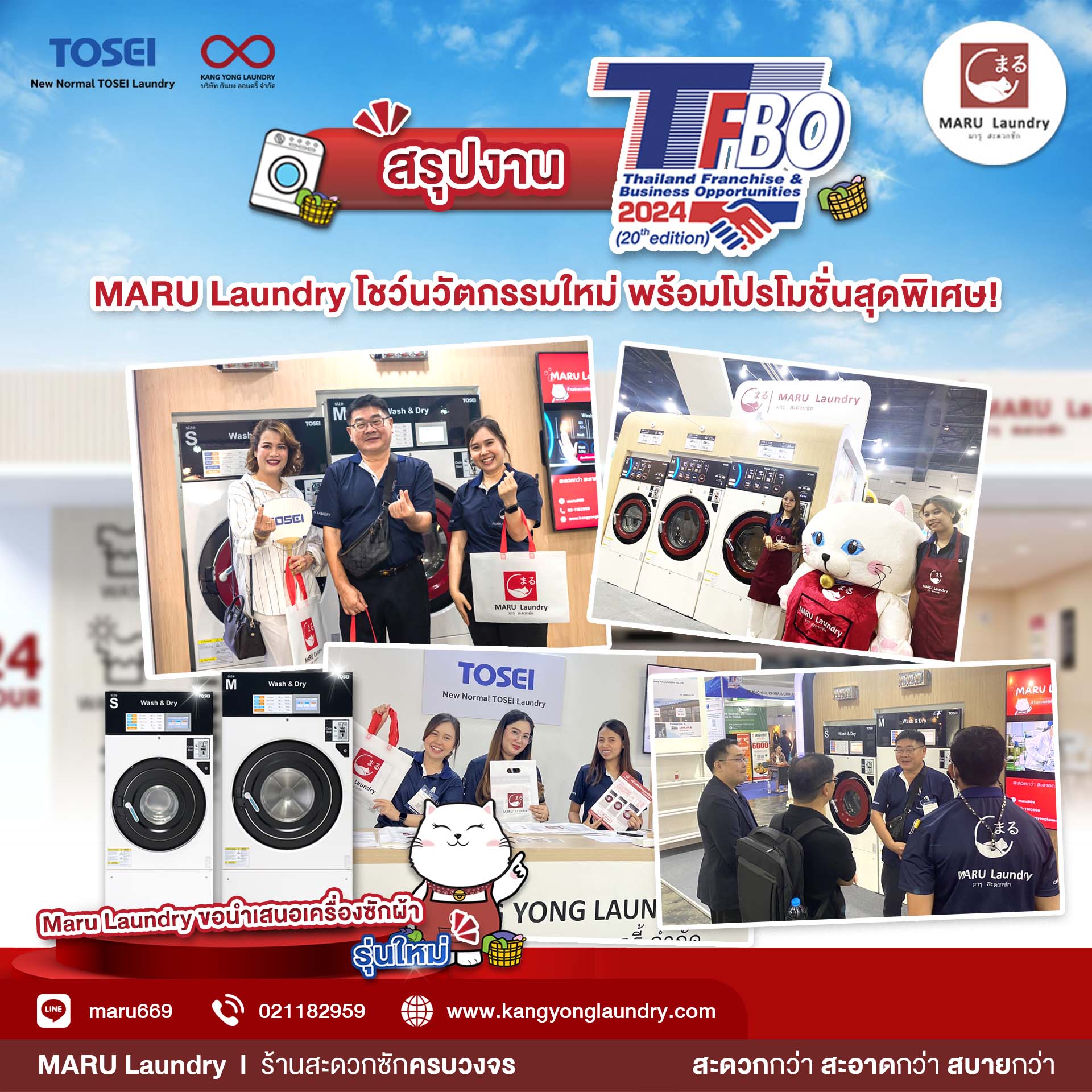 MARU Laundry มารุ สะดวกซัก ร้านซักผ้าหยอดเหรียญสไตล์ญี่ปุ่นรูปแบบใหม่ ทางเลือกดีที่สุดในการลงทุนสร้างรายได้และเติบโตได้อย่างมั่นคง ร่วมออกบูธภายในงาน TFBO 2024 ซึ่งจัดขึ้นเมื่อวันที่ 11 – 14 กรกฎาคม 2567 ณ ไบเทคบางนา ที่ผ่านมา โดยบูธ MARU Laundry ได้รับความสนใจจากผู้เข้าชมเป็นจำนวนมาก กลายเป็นไฮไลท์สำคัญที่หลายคนไม่พลาดแวะชม ด้วยความโดดเด่นที่แตกต่างจากร้านซักผ้าหยอดเหรียญแบรนด์อื่น ๆ พร้อมมอบโปรโมชันพิเศษให้กับผู้ที่สนใจภายในงาน