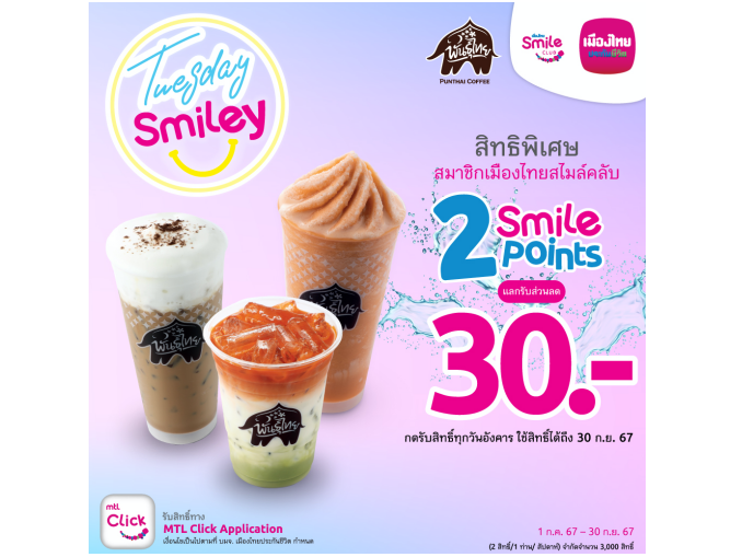 สาระ ล่ำซำ ประธานเจ้าหน้าที่บริหาร บริษัท เมืองไทยประกันชีวิต จำกัด (มหาชน) เปิดเผยว่า เมืองไทยประกันชีวิต โดยเมืองไทยสไมล์คลับ เดินหน้าส่งมอบความสุขและรอยยิ้มให้สมาชิกเมืองไทยสไมล์คลับ ด้วยการเพิ่มประสบการณ์สุดพิเศษ ล่าสุดจับมือกาแฟพันธุ์ไทย จัดแคมเปญ “Tuesday Smiley กาแฟพันธุ์ไทย” ด้วยการมอบสิทธิพิเศษสำหรับสมาชิกเมืองไทยสไมล์คลับ วันอังคารพอยท์น้อย เพียงใช้ 2 Smile Points แลกรับส่วนลด 30 บาท สำหรับซื้อเครื่องดื่มร้อน เย็น หรือปั่น ที่ร้านกาแฟพันธุ์ไทยทุกสาขา ยกเว้นสาขาท่าอากาศยาน โดยสามารถกดรับสิทธิ์ได้ทุกวันอังคารและเก็บโค้ดไว้ใช้ได้จนถึง 30 กันยายน 2567 ผ่านช่องทาง MTL Click Application ระยะเวลาการใช้สิทธิ์ 1 กรกฎาคม – 30 กันยายน 2567