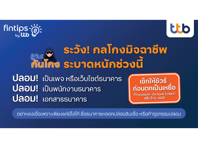 ช่วงนี้นอกจากข้าวของแพง เงินทองหายากแล้ว ชีวิตยังต้องลำบากกับการรับมือกลโกงมิจฉาชีพที่ระบาดหนักขึ้นทุกวัน แถมรูปแบบการหลอกลวงก็มีความหลากหลายและแนบเนียนขึ้นเรื่อยๆ ทั้งช่องทางพื้นฐาน ไปจนถึงแพลตฟอร์มออนไลน์ โซเชียลมีเดีย และแอปพลิเคชันต่างๆ ทำให้ใครหลายๆ คน ถูกดูดเงินออกจากกระเป๋าไปง่ายๆ เพียงเพราะความประมาท ขาดสติ และเท่าไม่ทันกลโกง วันนี้ fintips by ttb #เรื่องเงินที่รู้จริงแบบเพื่อนที่รู้ใจ จึงอยากชวนรู้ทันกันโกงของเหล่านักโจรกรรมทางการเงิน เพื่อไม่ให้ตกเป็นเหยื่อ