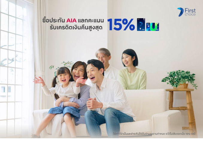 กรุงศรีเฟิร์สช้อยส์ จัดดีลคุ้มสำหรับสมาชิกบัตรเครดิตกรุงศรีเฟิร์สช้อยส์ วีซ่า แพลทินัม และเอ็กซ์ยู บัตรเครดิต ดิจิทัล ตั้งแต่ 1 ตุลาคม 2567 – 31 ธันวาคม 2567 เมื่อชำระค่าเบี้ยประกันเอไอเอที่ร่วมรายการทั้งปีแรกและปีต่ออายุผ่านบัตร รับสิทธิ์แลกคะแนนเป็นเครดิตเงินคืนสูงสุด 15% หรือ 13,500 บาท ตลอดรายการ เมื่อมียอดใช้จ่ายผ่านบัตรตามเงื่อนไข พร้อมรับสิทธิ์แบ่งเบาภาระค่าใช้จ่ายเปลี่ยนยอดรูดเต็มเป็นผ่อน 0% นาน 3 เดือนได้ด้วยตัวเองผ่านฟีเจอร์ U PLAN บนแอป UCHOOSE (เงื่อนไขเป็นไปตามที่กำหนด)
