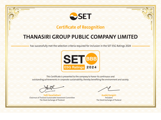 ภายใต้ปรัชญาการสร้างสมดุลระหว่างการดำเนินธุรกิจ พร้อมดูแลสังคม และสิ่งแวดล้อม สู่การได้รับการคัดเลือกเป็น 1 ในบริษัทหุ้นยั่งยืน SET ESG Ratings 2024 ระดับ “BBB” จากบริษัทที่ผ่านเกณฑ์และได้รับการคัดเลือกทั้งหมด 228 บริษัท มีบริษัทอสังหาริมทรัพย์และก่อสร้างเข้าร่วมการประเมินจำนวน 54 บริษัท โดย THANA เป็น 1 ในจำนวน 34 บริษัทอสังหาริมทรัพย์และก่อสร้างที่สามารถผ่านเกณฑ์การประเมินในครั้งนี้