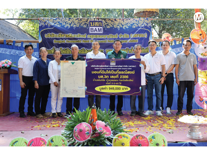 เมื่อเร็วๆนี้ บัณฑิต อนันตมงคล (ที่ 5 จากซ้าย) ประธานเจ้าหน้าที่บริหาร ดร.วุฒิพันธุ์ ตวันเที่ยง (ที่ 5 จากขวา) รองประธานเจ้าหน้าที่บริหาร พร้อมด้วยคณะผู้บริหารและพนักงาน บริษัทบริหารสินทรัพย์ กรุงเทพพาณิชย์ จำกัด (มหาชน) หรือ BAM ร่วมส่งมอบที่ดินทรัพย์สินรอการขาย (NPA) โฉนดที่ดิน นส.3ก เลขที่ 2386 ตำบลอินทขิล อำเภอแม่แตง จังหวัดเชียงใหม่ เนื้อที่กว่า 3 ไร่ มูลค่ารวม 949,000 บาท ให้กับวัดมืดกาพัฒนาราม เพื่อเป็นสาธารณกุศลในโอกาสครบรอบ 25 ปี โดยมี ประภาส ทาสม ผู้ใหญ่บ้านมืดกา และ ทองอินทร์ แสนไชยน้อย ไวยาวัจกรของวัด เป็นผู้แทนรับมอบ