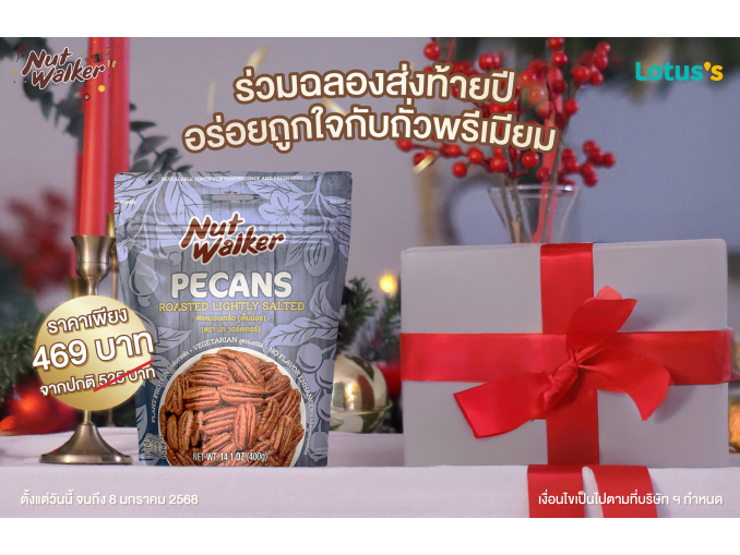 นัท วอล์คเกอร์ ผลิตภัณฑ์ถั่วคุณภาพพรีเมียมพร้อมทานภายใต้การดูแลของเครือเฮอริเทจ เชิญทุกท่านร่วมอิ่มอร่อยกับ นัท วอล์คเกอร์ พีแคนอบเกลือ (เค็มน้อย) ขนาด 400 กรัม ในราคาเพียง 469 บาท จากปกติ 525 บาท พกพาง่าย อร่อยเพลิน จะทานเล่นในยามว่าง หรือมอบเป็นของขวัญให้คนที่คุณรักในวันปีใหม่ ก็สุขใจได้ไม่แพ้กัน ให้ นัท วอล์คเกอร์ เป็นตัวแทนมอบความสุขให้ทุกคน ตั้งแต่วันนี้ จนถึง 8 มกราคม 2568 ที่โลตัสทุกสาขา นัท วอล์คเกอร์ กินเล่นๆ ได้ประโยชน์จริงๆ