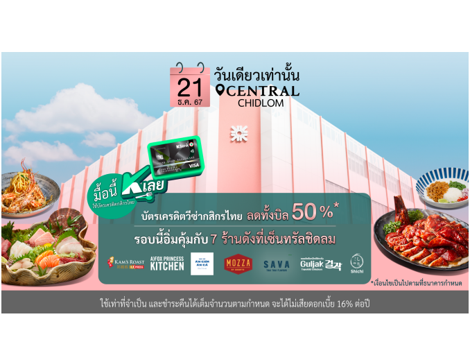 บัตรเครดิตวีซ่ากสิกรไทย เสิร์ฟความอิ่มอร่อยสุดคุ้มอีกแล้วกับแคมเปญ “มื้อนี้ K เลย” ลดทั้งบิล 50%* (สูงสุด 500 บาท) โปรแรงถูกใจสายกินครั้งนี้ ได้ฟินจัดกับความอร่อยล้ำของ 7 ร้านอาหารดังระดับพรีเมียมที่เซ็นทรัล ชิดลม วันเสาร์ที่ 21 ธันวาคม 67 นี้ วันเดียวเท่านั้น