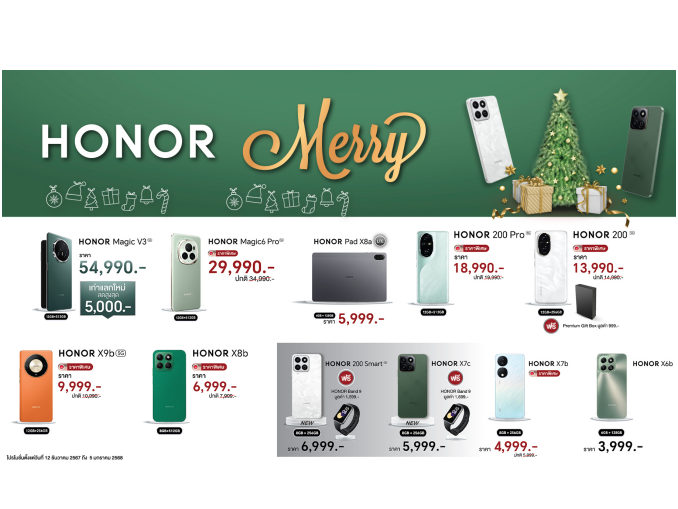 คริสต์มาสนี้ HONOR จัดเต็ม! มอบความสุขให้กับนักช้อปทั่วไทยด้วยแคมเปญสุดพิเศษ “HONOR Merry Christmas” ที่ยกขบวนสมาร์ตโฟนและแท็บเล็ตคุณภาพสูง พร้อมเทคโนโลยีสุดล้ำ มาในราคาที่ใครก็เป็นเจ้าของได้ ตั้งแต่วันนี้ถึงวันที่ 5 มกราคม 2568 นักช้อปจะได้พบกับส่วนลดสูงสุด5,000 บาท และข้อเสนอสุดเร้าใจอีกมากมาย หรือของแถมสุดเอ็กซ์คลูซีฟที่คัดสรรมาเพื่อลูกค้าคนพิเศษของ HONOR เท่านั้น รีบคว้าโอกาสดีๆ นี้ก่อนหมดเวลา แล้วมาร่วมฉลองเทศกาลแห่งความสุขไปพร้อมกัน!